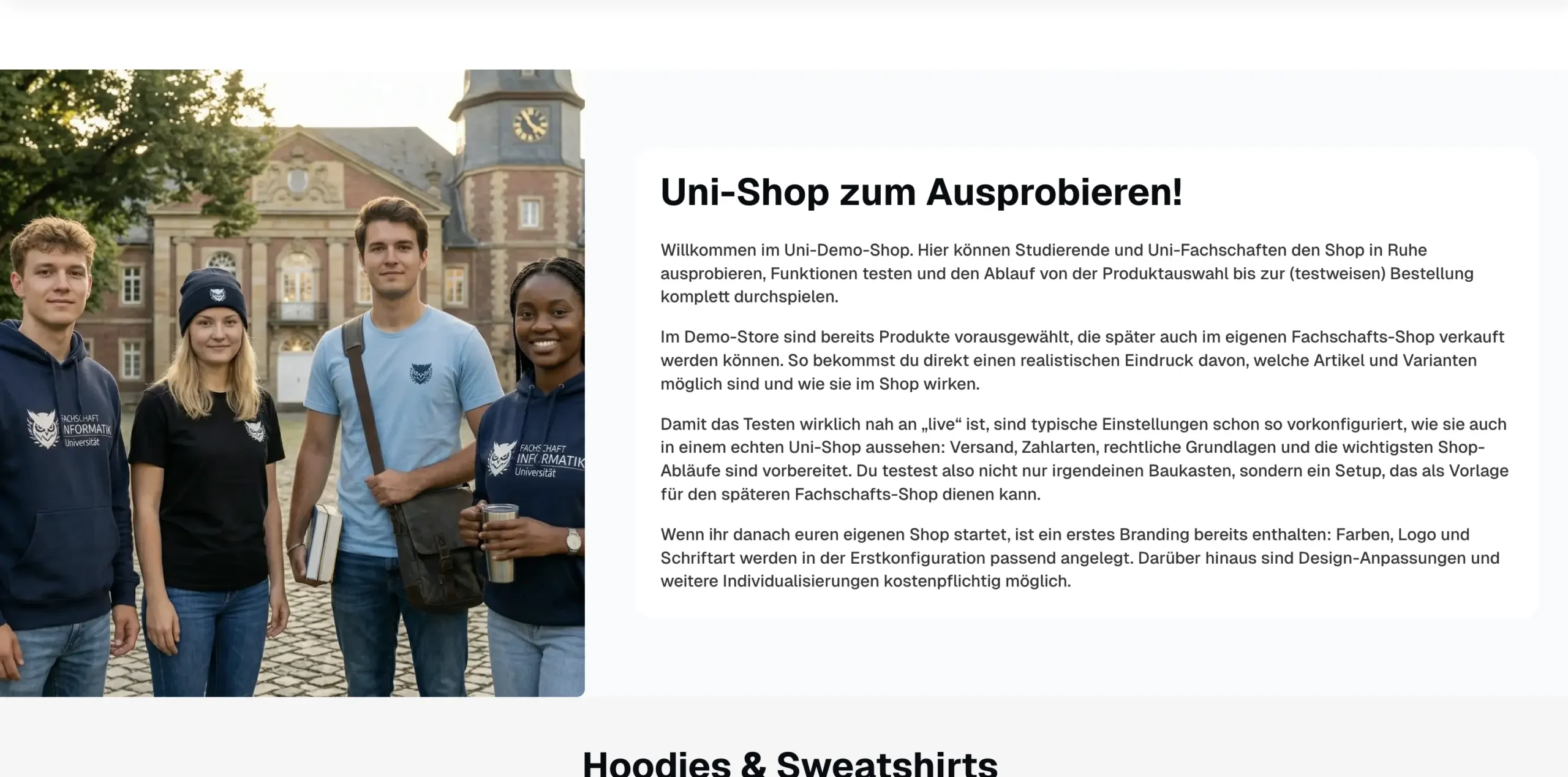 Wir richten eurer Fachschaft oder eurem Verein einen fertigen Online-Shop ein – mit eigener Kollektion, eurem Branding und ohne dass ihr einen Cent vorstreckt.